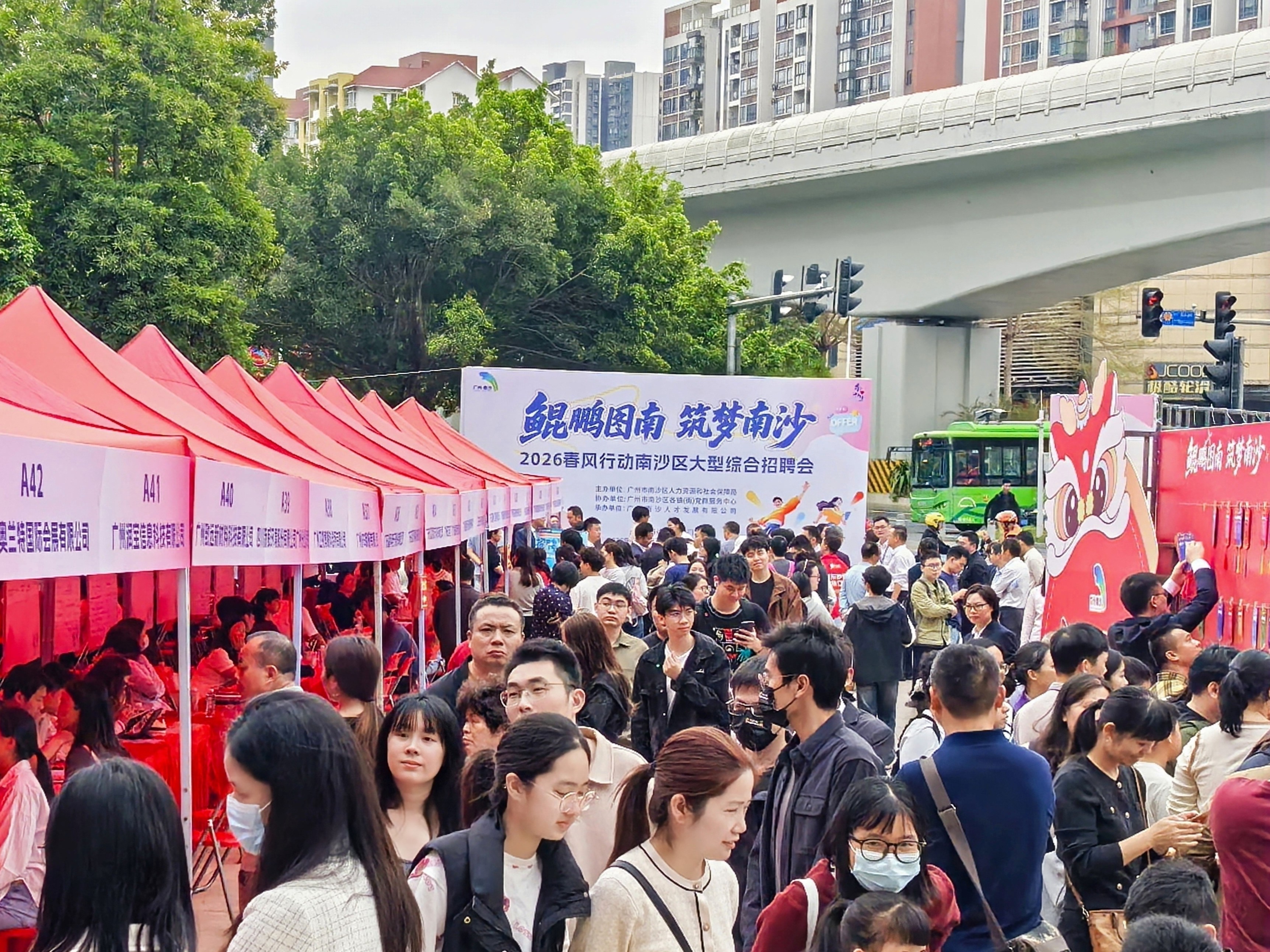 奔马踏春,职暖人心。2月26日,南沙万达广场1号门前,红色帐篷和招工横幅一字排开,与广场上熙攘的求职人流、热烈的交谈声交织成一幅生机勃勃的“湾心招才图”。